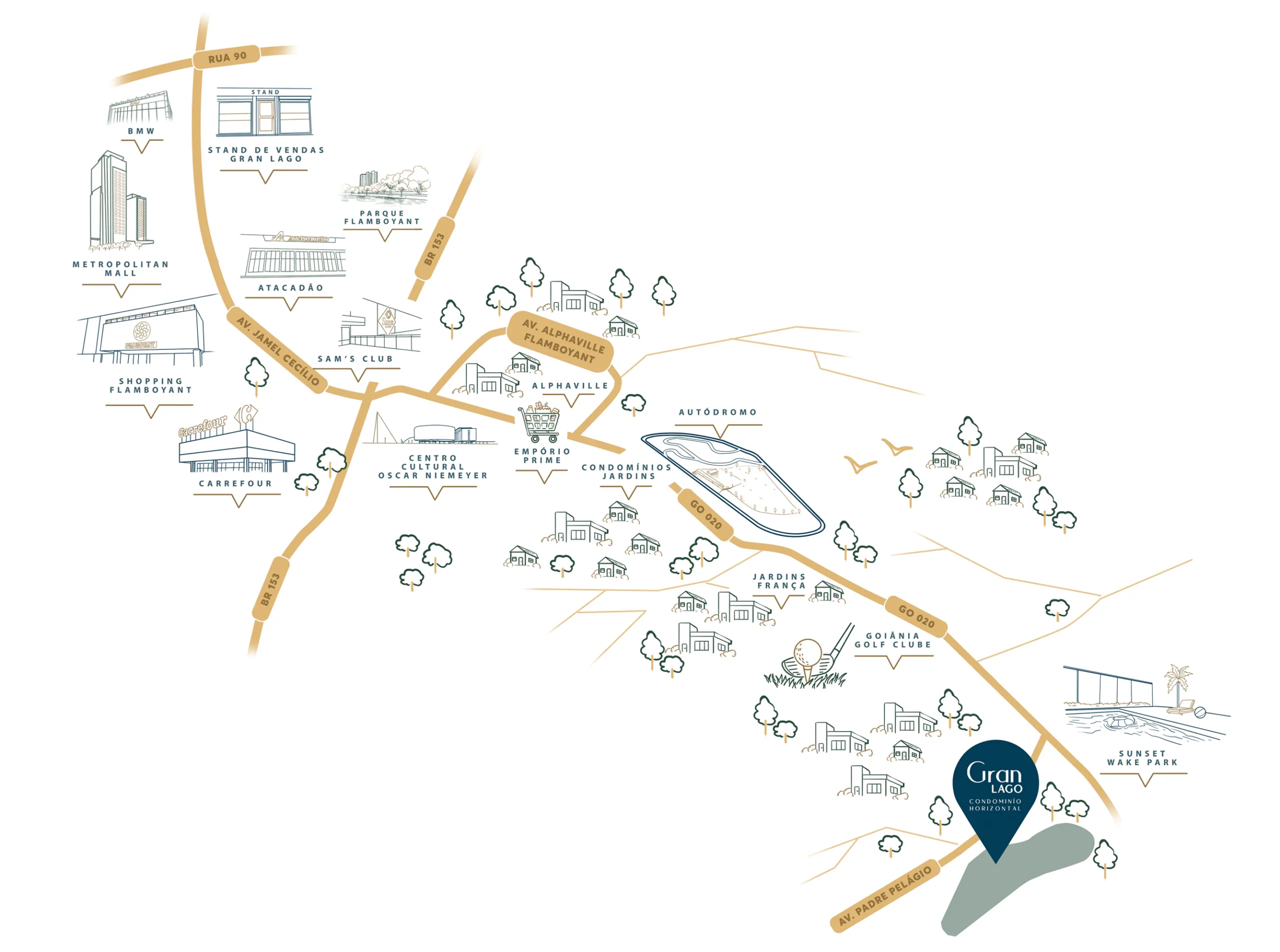 Loteamento do tipo fechado denominado Gran Lago Condomínio Horizontal, de responsabilidade da Vale do Jordão Empreendimentos LTDA, inscrita no CNPJ 50.215.980/0001-18. Empreendimento registrado sob a matricula nº 27.286 no Cartório de Registro de Imóveis de Bela Vista de Goiás – GO. Todas as imagens constantes deste material são ilustrativas e poderão ser alteradas pelo empreendedor sem prévia comunicação. As especificações de paisagismo e equipamentos de lazer serão entregues em conformidade com o memorial descritivo do empreendimento. Registro número R.5 – 27.286. Perspectivas artísticas preliminares, sujeitas a alteração.